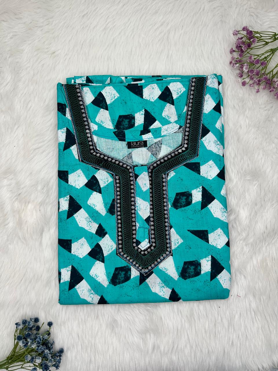 Cadet Blue Normal Zip Embroidery Neck Pure Cotton Nighty Plus Size Short Sleeve (Suits for bra size 40″- 46″ | 54-56 inch length)