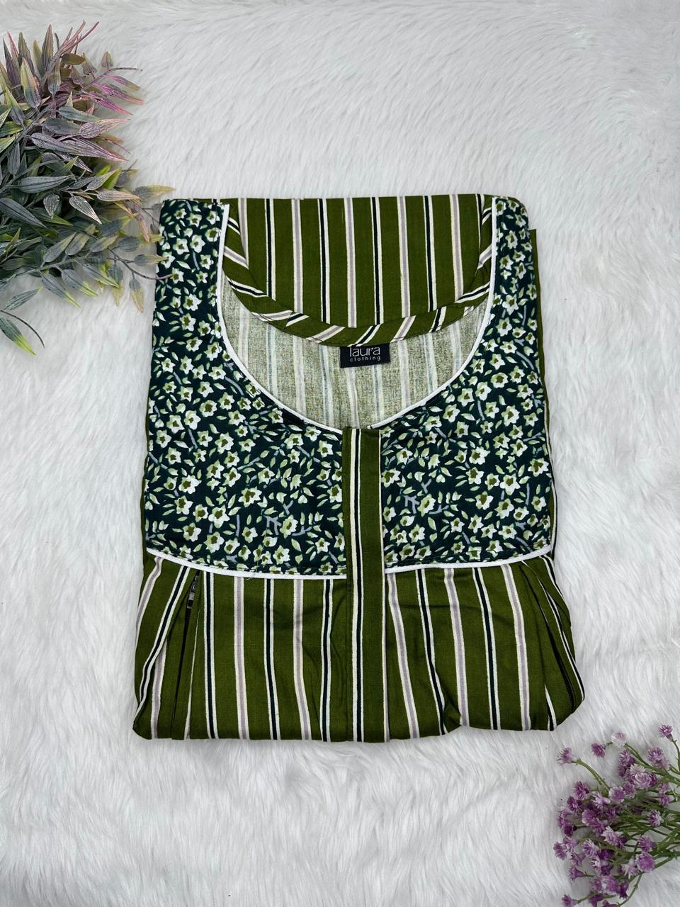 Myrtle and Dark Jungle Green Printed Round Neck Pleated Pure Cotton Feeding Nighty With Two Side Vertical Zip and Single Centre Zip Free Size Short Sleeve (Suits for bra size 34″- 40″ | 54-56 inch length)