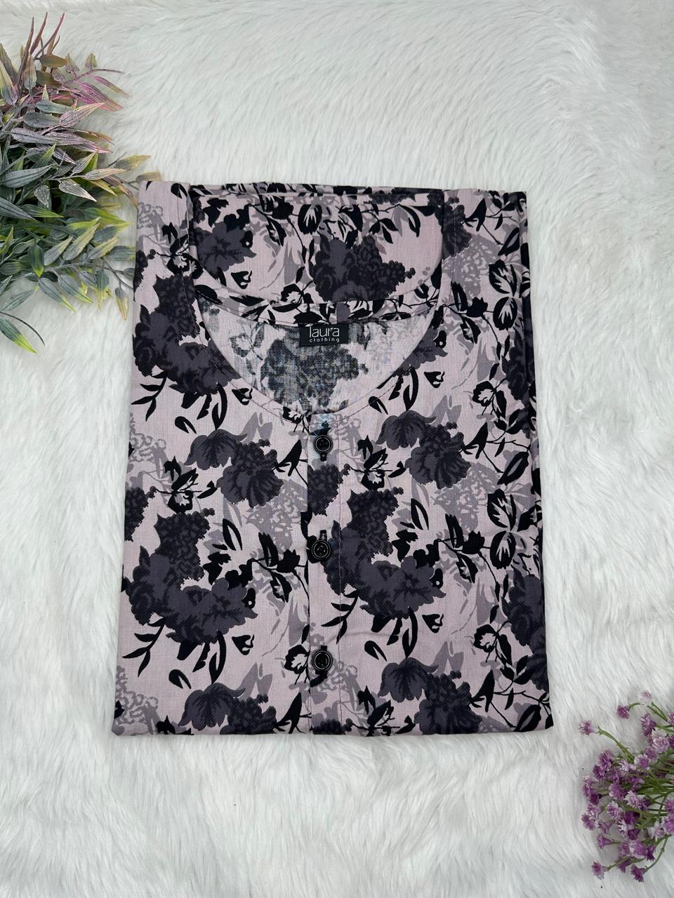 Dark Grey Printed Round Neck Pure Cotton Full Open Button Labour Room Nighty Free Size Short Sleeve (Suits for bra size 34″- 40″ | 54-56 inch length)
