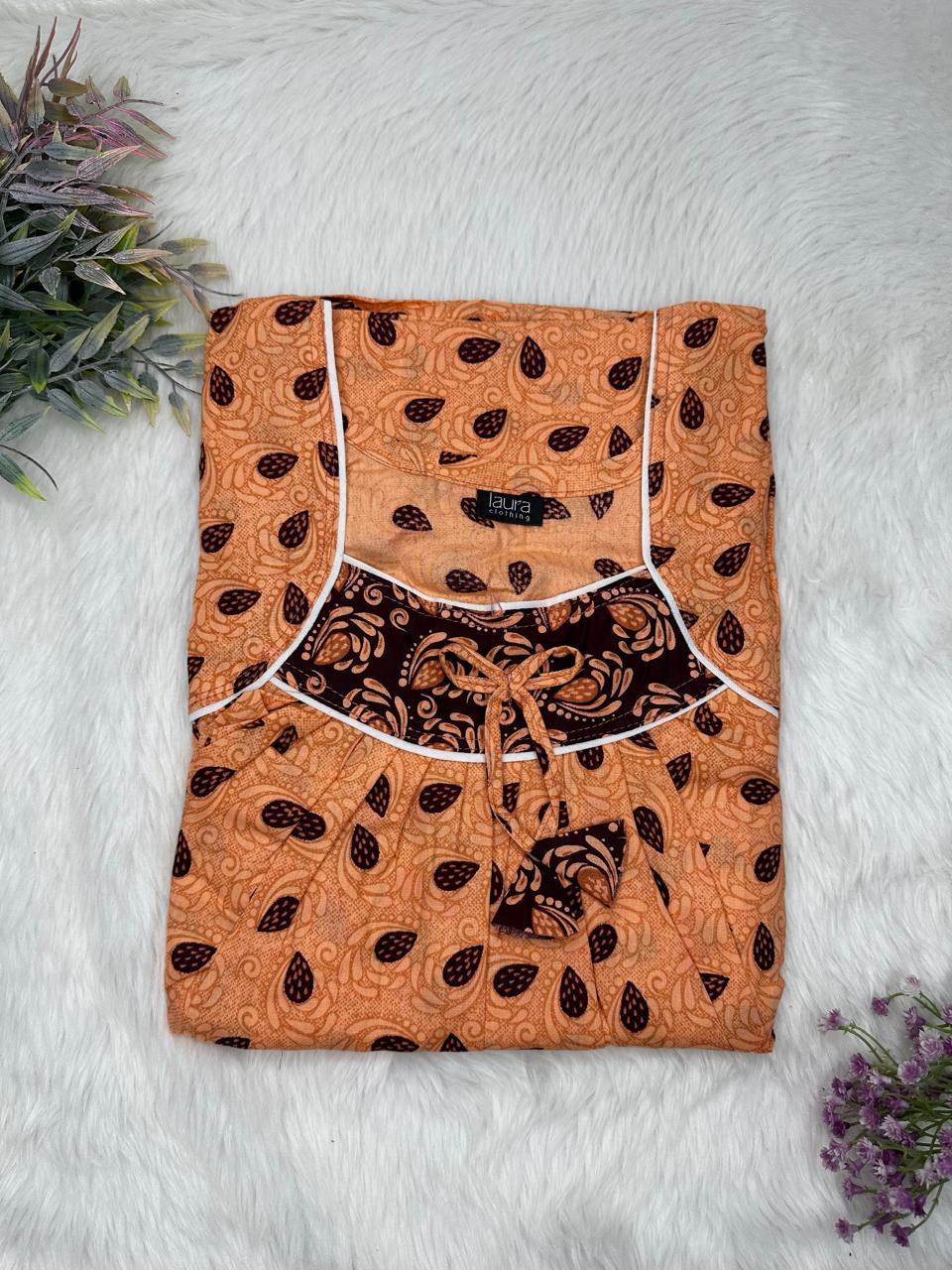 Raw Sienna Printed Square Neck No Zip Pleated Pure Cotton Nighty Free Size Short Sleeve (Suits for bra size 34″- 40″ | 54-56 inch length)