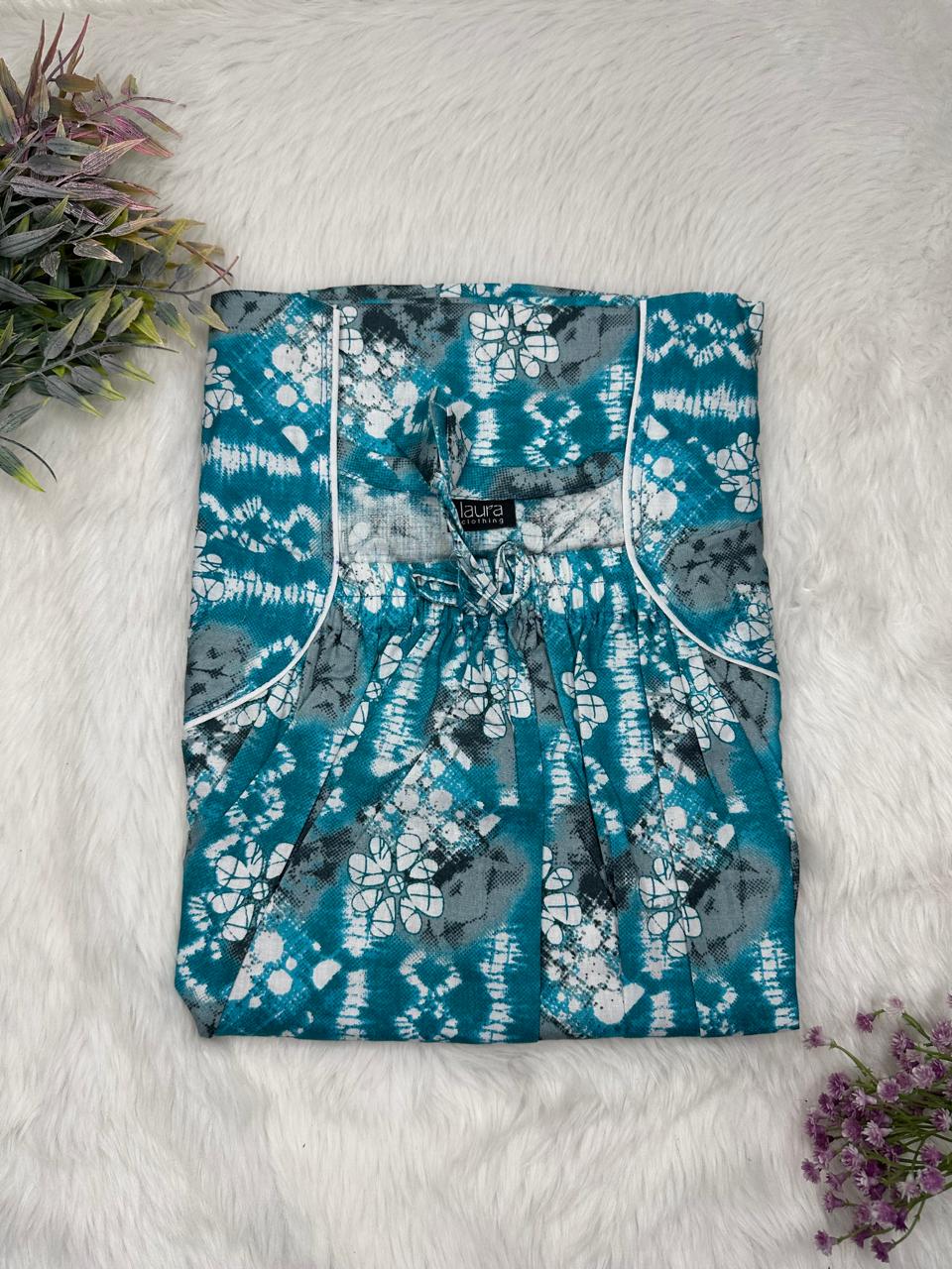 Muted Blue Printed Cotton Square Neck Elastic Pleated Nighty Free Size Short Sleeve (Suits for bra size 34″- 40″ | 54-56 inch length)
